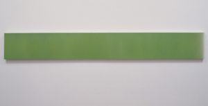 Using data from Environment Canada, this work documents the average daily temperature for Toronto from January 1 to December 31, 2001. The 7.5′ long panel is divided into 365 vertical bars. Each bar is 1/4″ wide. The colour representing each day’s average temperature is glazed over the preceding days, so that January 1 has 365 glazes and December 31 only one. In this way, the most recent colour dominates or “colours” what has gone before.