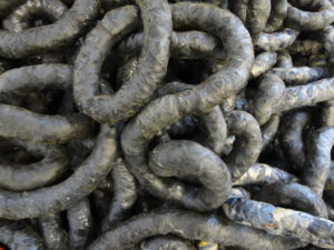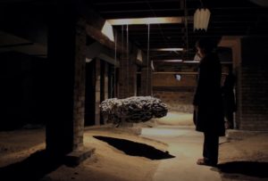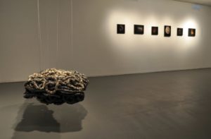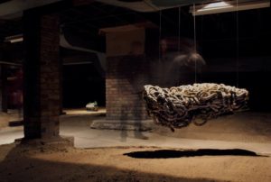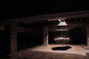 Clothing that belonged to my late brother and father was shredded and fed through many meters of sausage casing to create a large mass that was suspended from the ceiling, hovering just over the ground. The wormy mass appears both intestinal and cloud-like, alluding to the experience of loss as both a weight and an emptiness.